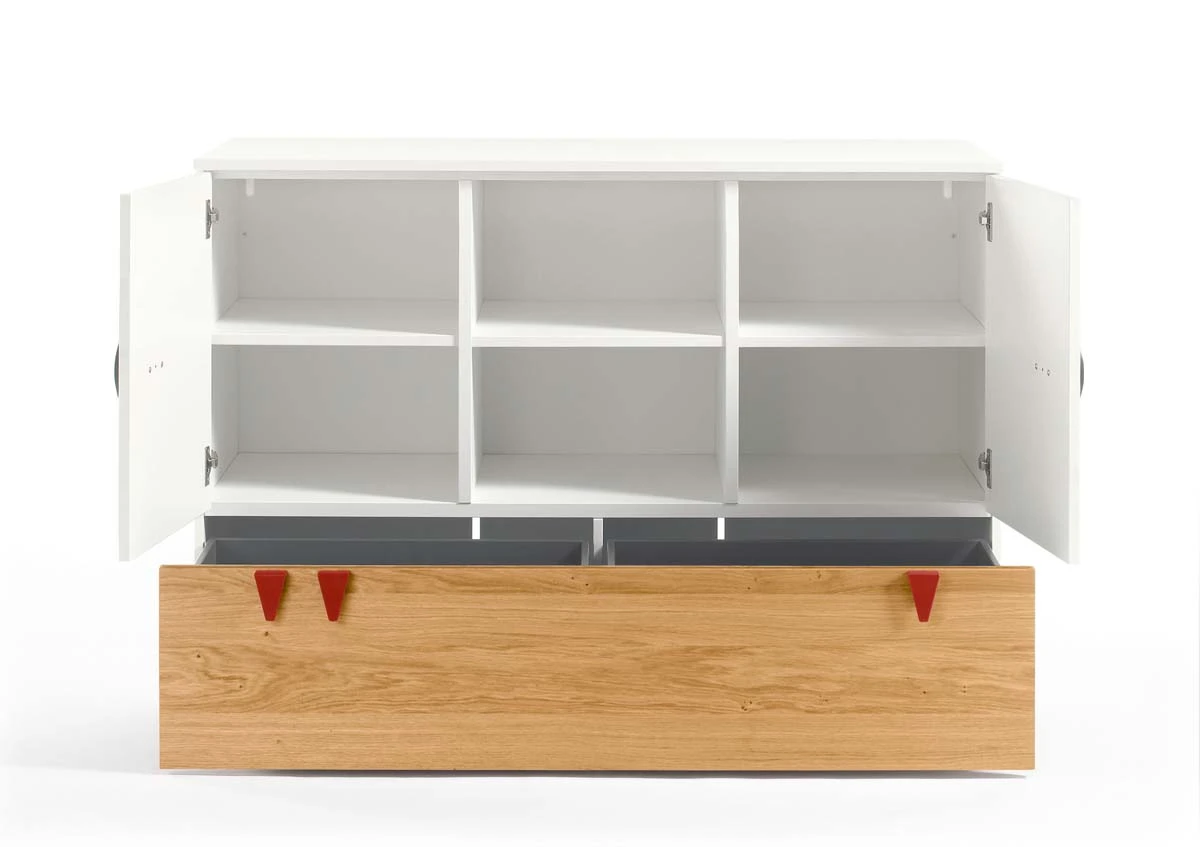 Farbe: Kommode: Weiß / Natureiche Wickelaufsatz: wählbar Versand & Lieferdetails: Die Lieferung erfolgt über Speditionsversand, frei Bordsteinkante. Ihre Ware erreicht Sie sicher verpackt auf einer Einwegpalette. Die Palette verbleibt bei Ihnen Lieferzustand: Zerlegt, im Karton Material: Melaminharzbeschichtete Spanplatten Produktdetails: Wickelkommode: 2 Türen mit je einem Einlegeboden 1 Schublade mit gedämpftem Selbsteinzug als Vollauszug 2 offene Fächer maximale Belastung Einlegeboden 15 kg inkl. 1,8 cm hohen Stellfüßen Höhe ohne Stellfüße: 93,3 cm Höhe mit Stellfüßen: 95,1 cm mit 3 roten "Zähnen" im Design inkl. Wickelaufsatz Wickelauflage: abwaschbarer Bezug mit Thermovliesfüllung Sicherheit durch dreiseitigen Abrollschutz 5 Jahre Herstellergarantie Abmessungen: Kommode: 135,2 x 53,1 x 93,3 cm (BxTxH) Wickelaufsatz: 135,2 x 80 x 14 cm (BxTxH) Unterstellregal jeweils: 18 x 22,5 x 93,3 cm (BxTxH) Wickelauflage: 85 x 70 x 6 cm (BxTxH)