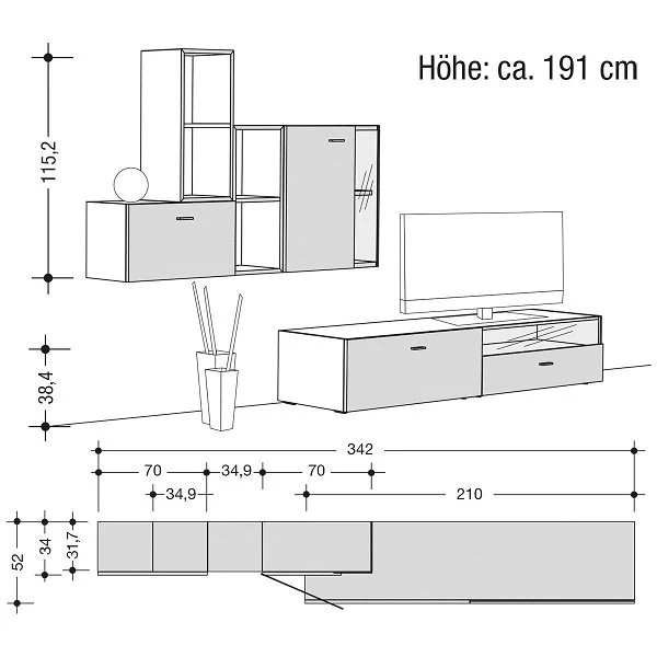 Gesamt: 191 x 390 x 52 cm (H x B x T)
